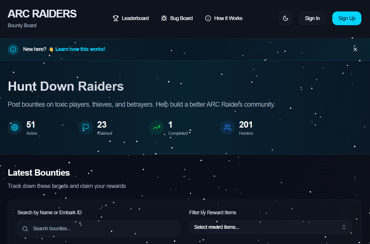 Several fan projects have appeared with the same basic idea: if someone treats you badly in a raid, you can post a “bounty” on them that other players can claim. One site at arc-bounty.com presents itself as an ARC Raiders Bounty Board, with navigation for a Leaderboard, a Bug Board, and a “How It Works” section. The pitch is simple: post bounties on “toxic players, thieves, and betrayers,” then track eliminations and submit proof.