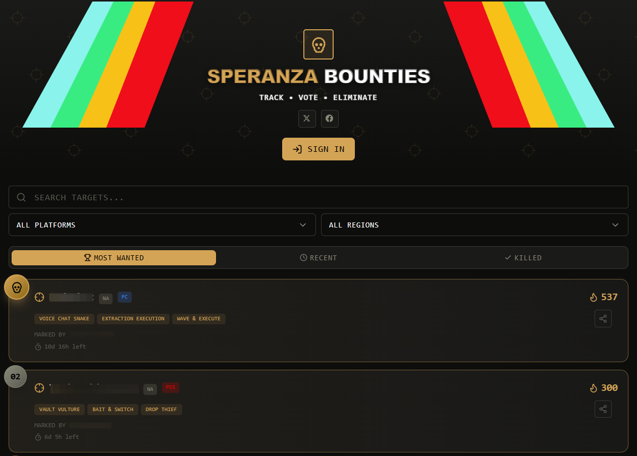 Step 3: Other players browse or search the bounty lists. On Speranza Bounties, entries stay live for 30 days, so the list gradually fills with active targets, recently claimed ones, and expired entries.