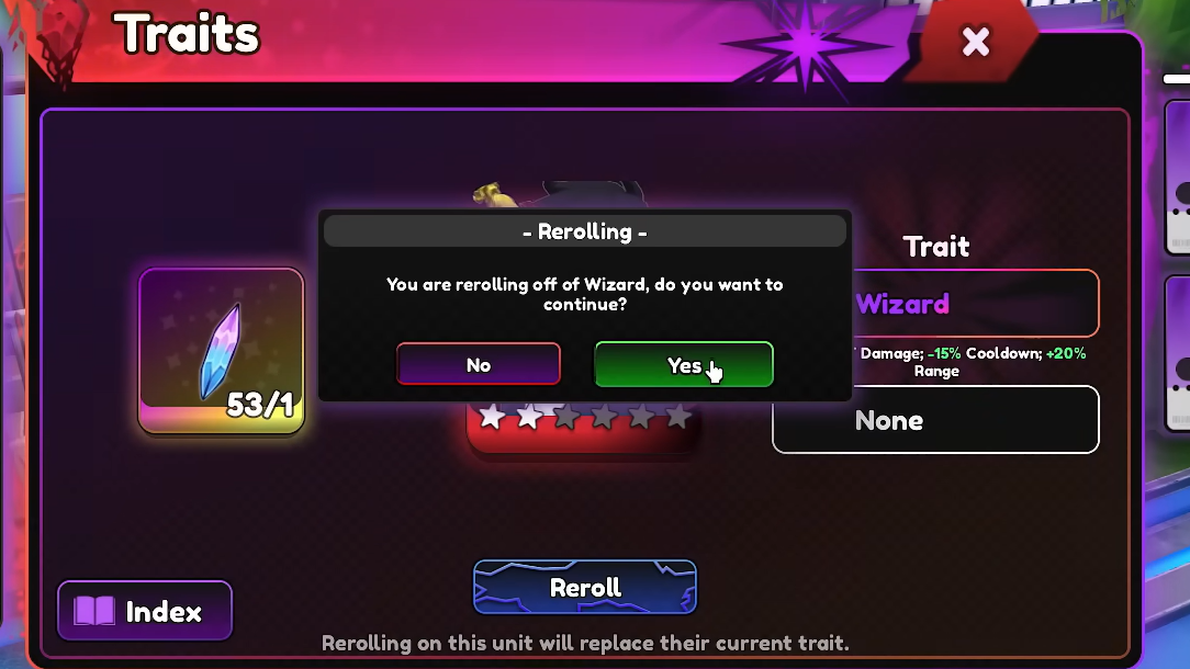 Trait reroll tokens let you randomize a unit’s trait. Traits can impact damage, cooldown, range, economy, or more specialized behavior. Some of the most valuable traits have sub‑1% chances to appear.