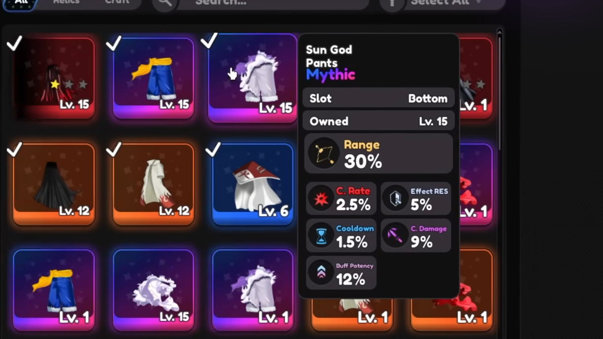 Each relic has a main perk and several side perks, all rolled randomly, along with a two‑piece set bonus if you equip matching tops and bottoms. Rarities range from rare through mythic, and fully upgrading a relic to level 15 consumes a significant number of enhancement stones.