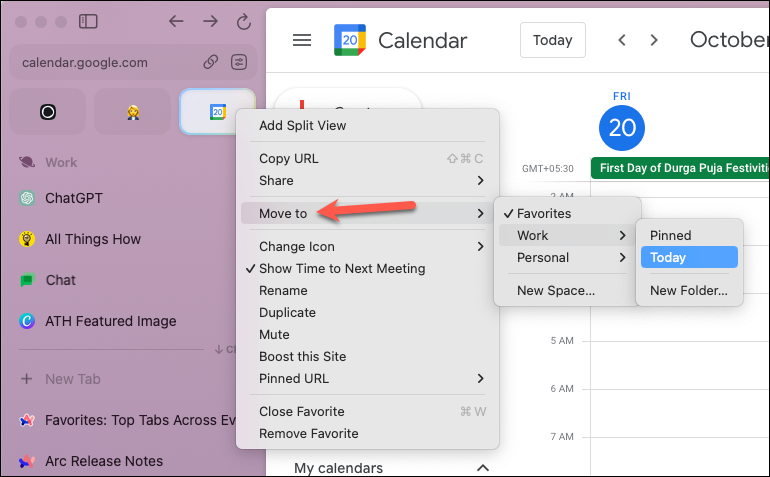 Move To>[Sidebar section]. For example, to move it to pinned tabs, go to[Space Name]>Pinnedand to move it to unpinned tabs, go to[Space name]> Today.