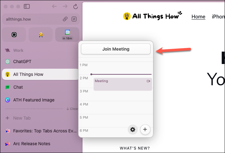 For some websites, you can even hover over the icon in the sidebar to view information instead of having to open the tab. For example, if you have Google Calendar as a Favorite, you can simply hover over its icon and get information about upcoming events and even hop on any upcoming meetings straight from the little preview window. You'll need to give Arc access to your Google Calendar for it, though.