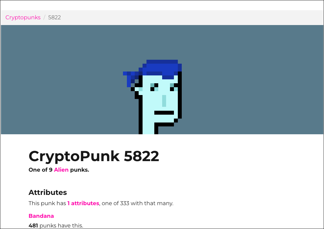 As a general rule, NFTs in the collection with rare traits are more valuable than the ones sporting common traits. Consider again, CryptoPunk #5822. It is an alien punk (only 9 in existence) with a bandana. The combination of rare traits makes it a desirable NFT.