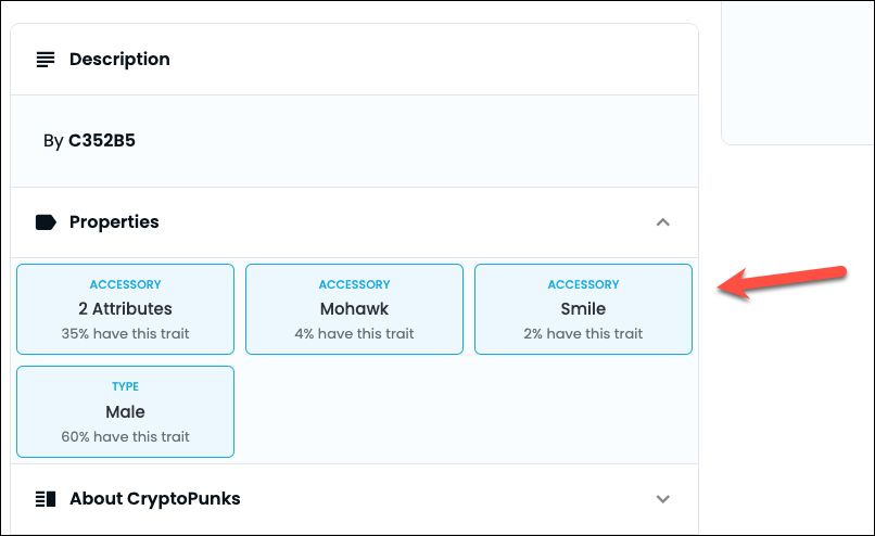 When you go to a listing page for the NFT on the marketplace, you’ll be able to see these traits in the ‘Properties’ section with the percentage of the collection that has each trait.