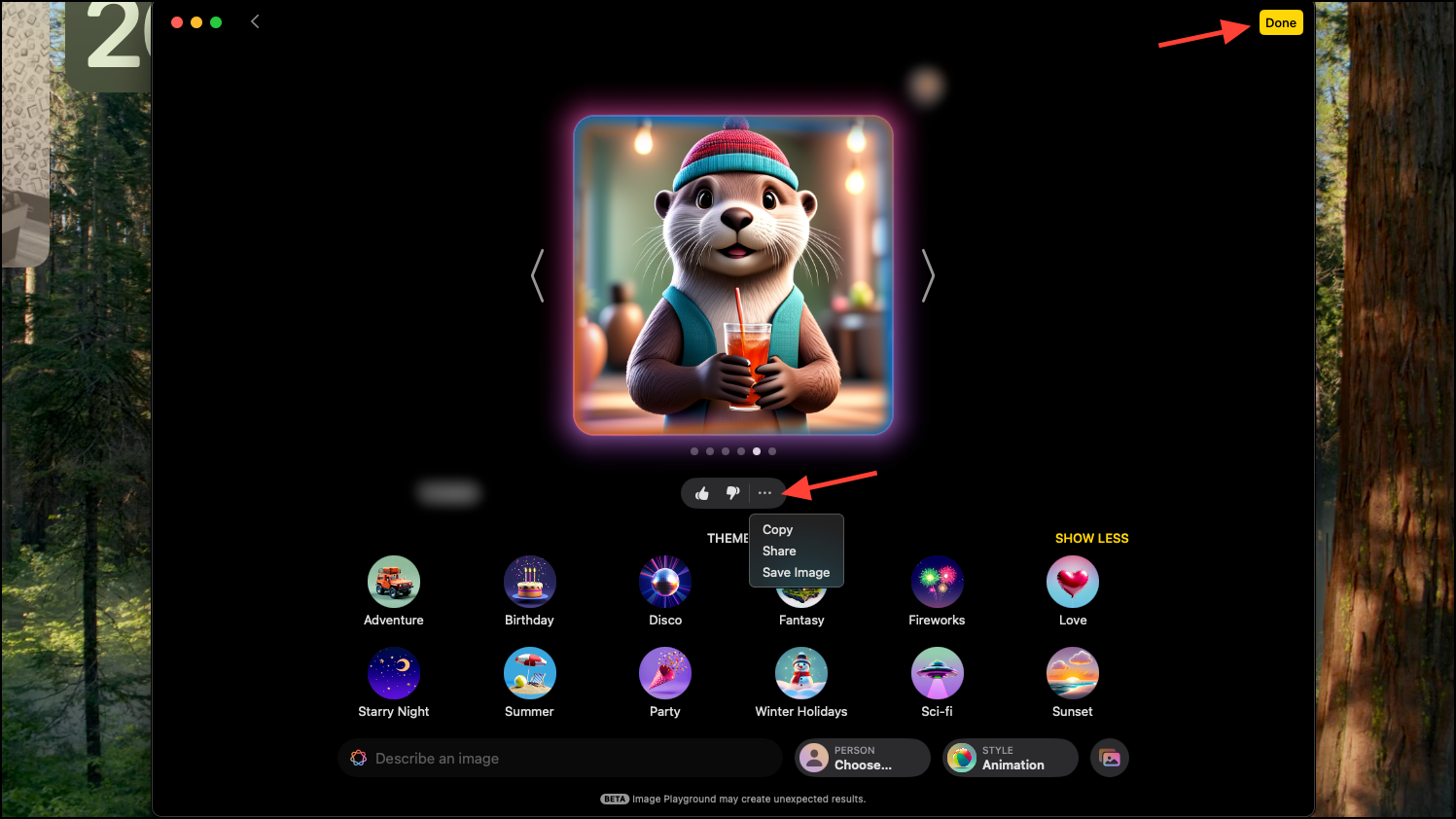 - If you like an image, you can click on 'Done' in the top-right corner to save it to your Image Playground library. This would close the current image and take you to the app library.