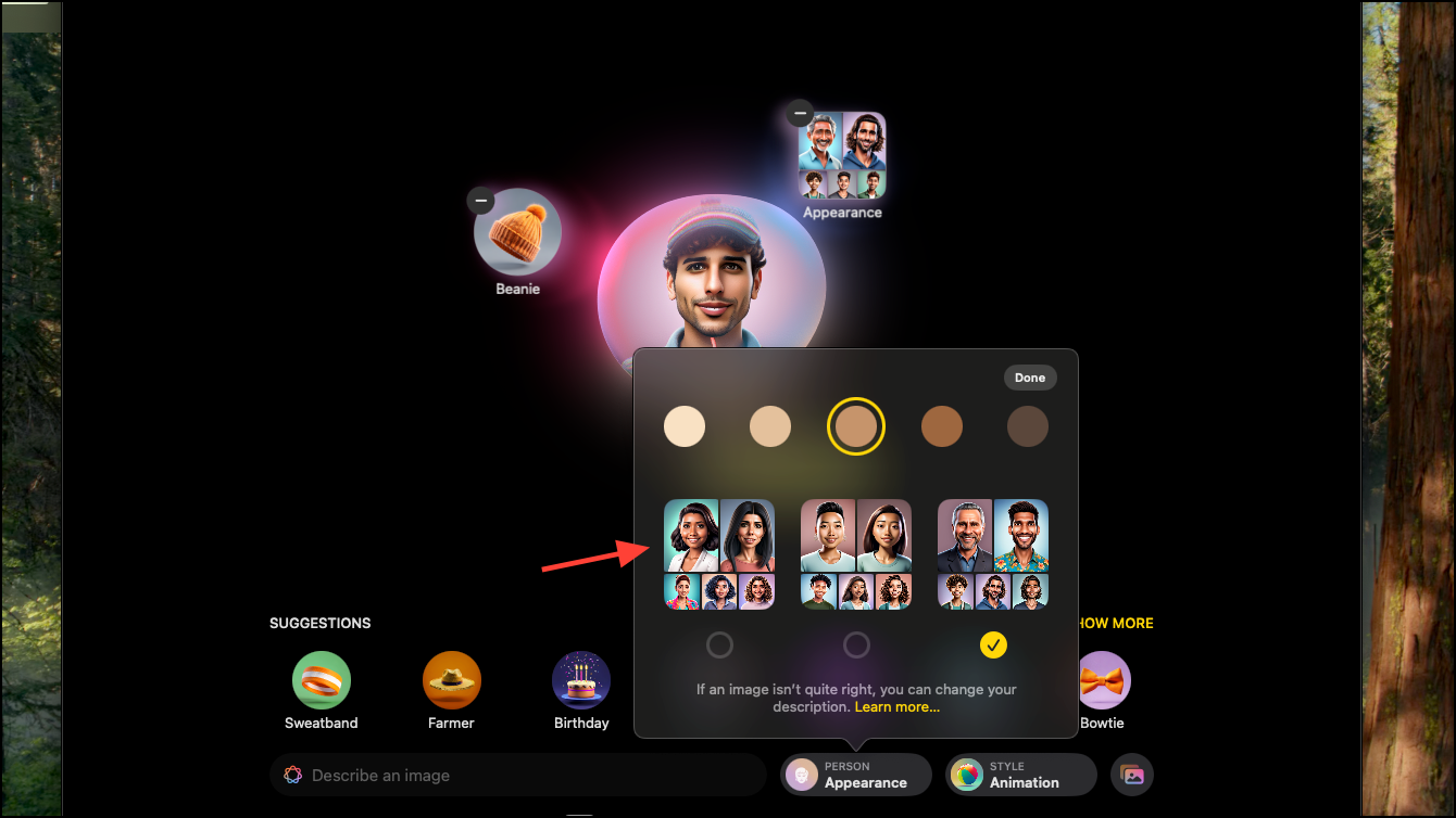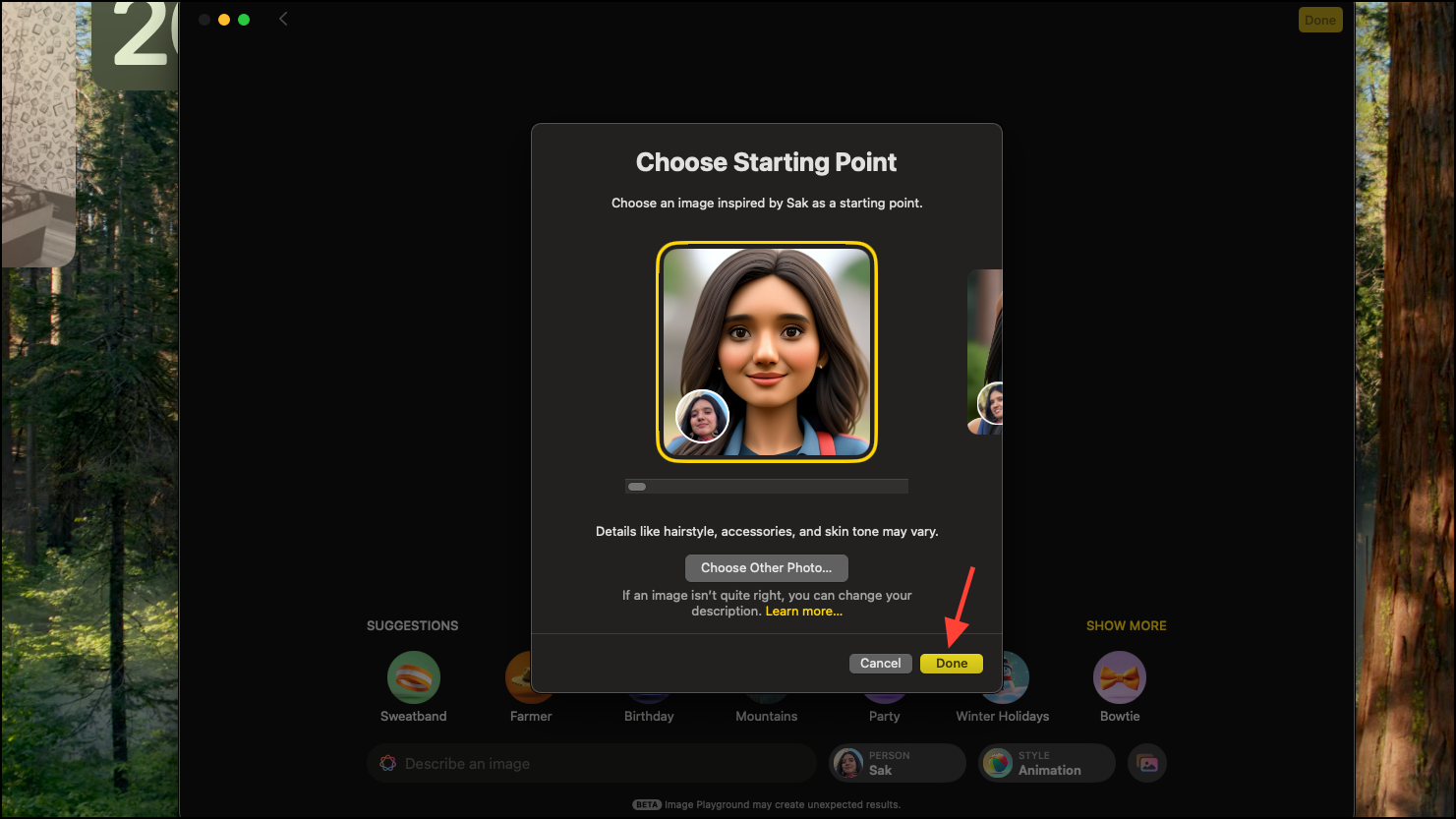 - You'll also be able to choose from a few of their photos to decide which likeness you best like as the starting point. Scroll through the different photos provided by Apple Intelligence or choose one yourself by clicking the 'Choose Other Photo' button. Click on 'Done' and the app will use this photo as a reference for the person going forward; however, you can edit it later at any time.