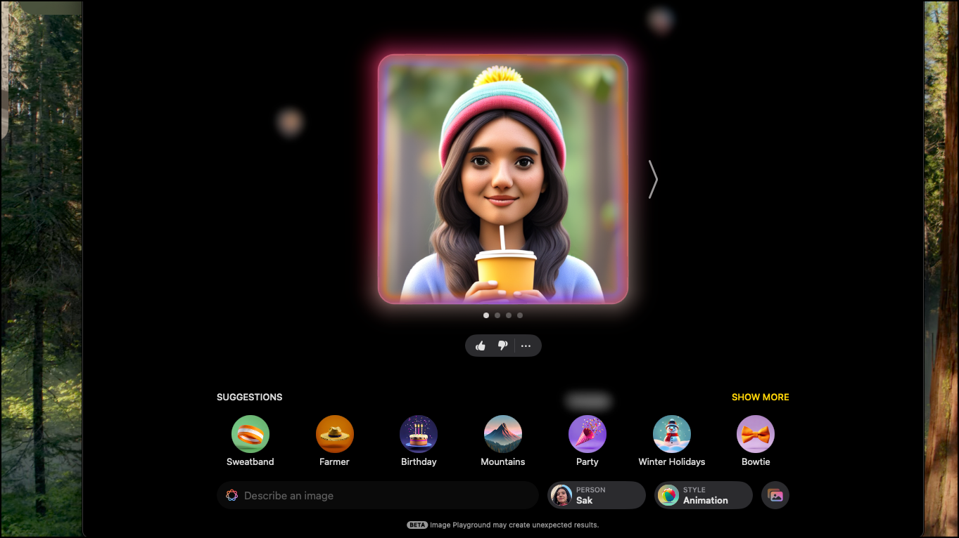 - Click on the right arrow (or swipe left on iPhone) to view more images. As mentioned above, Image Playground keeps generating images with changes in real-time as you add more elements/ descriptions. Since the processing is also done on the device, it keeps creating images as you navigate to the right.