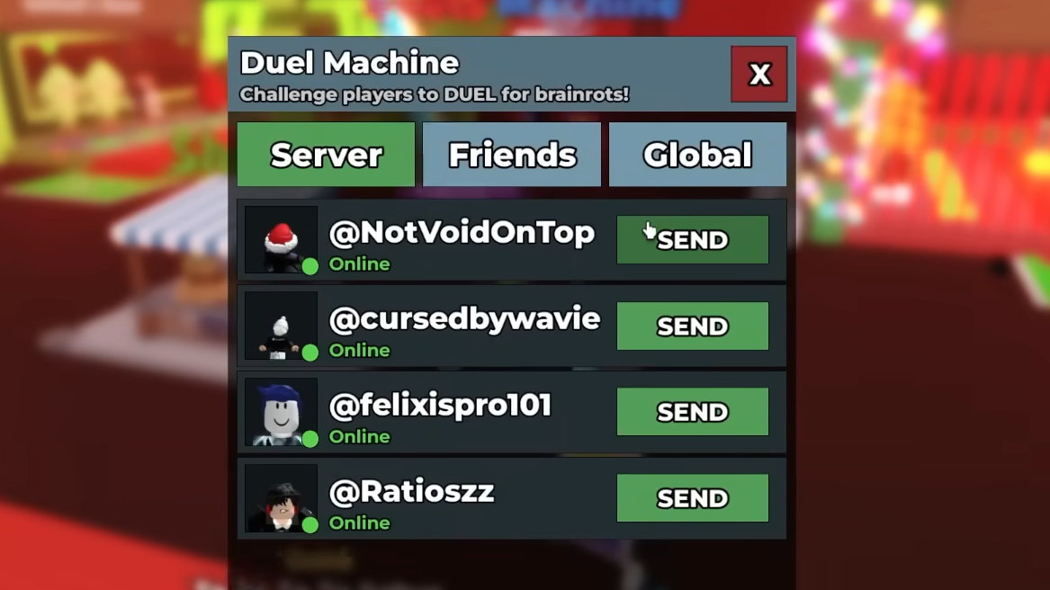Step 2: Use the duel menu to choose who you want to fight. You can select a player from your current server, pick someone from your friend list, or search by their global username.