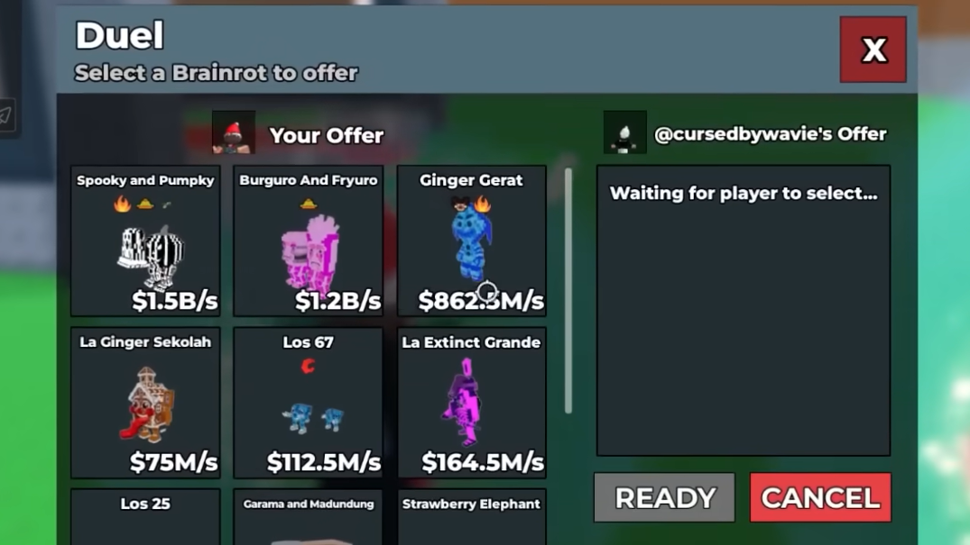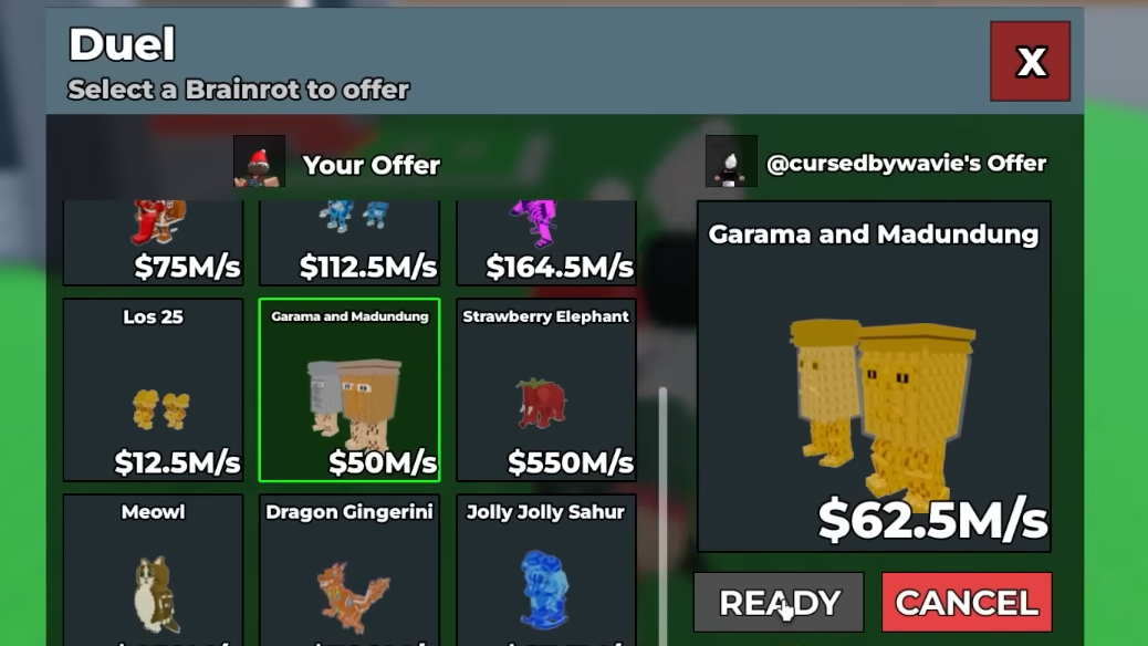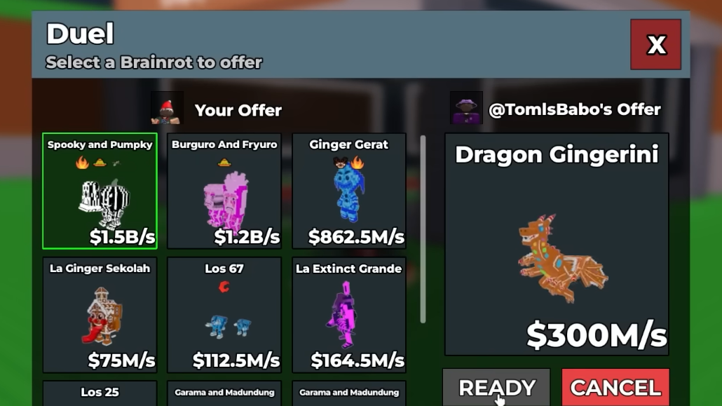 Step 5: Once inside the duel server, each of you chooses a single Brainrot from your inventory to wager. Both offers are displayed clearly on screen, including their income, so you can see which one is stronger at a glance.