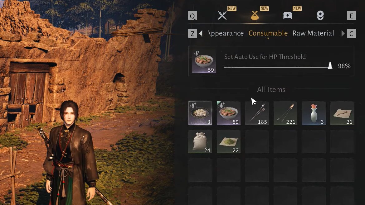 Step 4: Stock up, then consume the food from your consumables bag before long gathering runs.