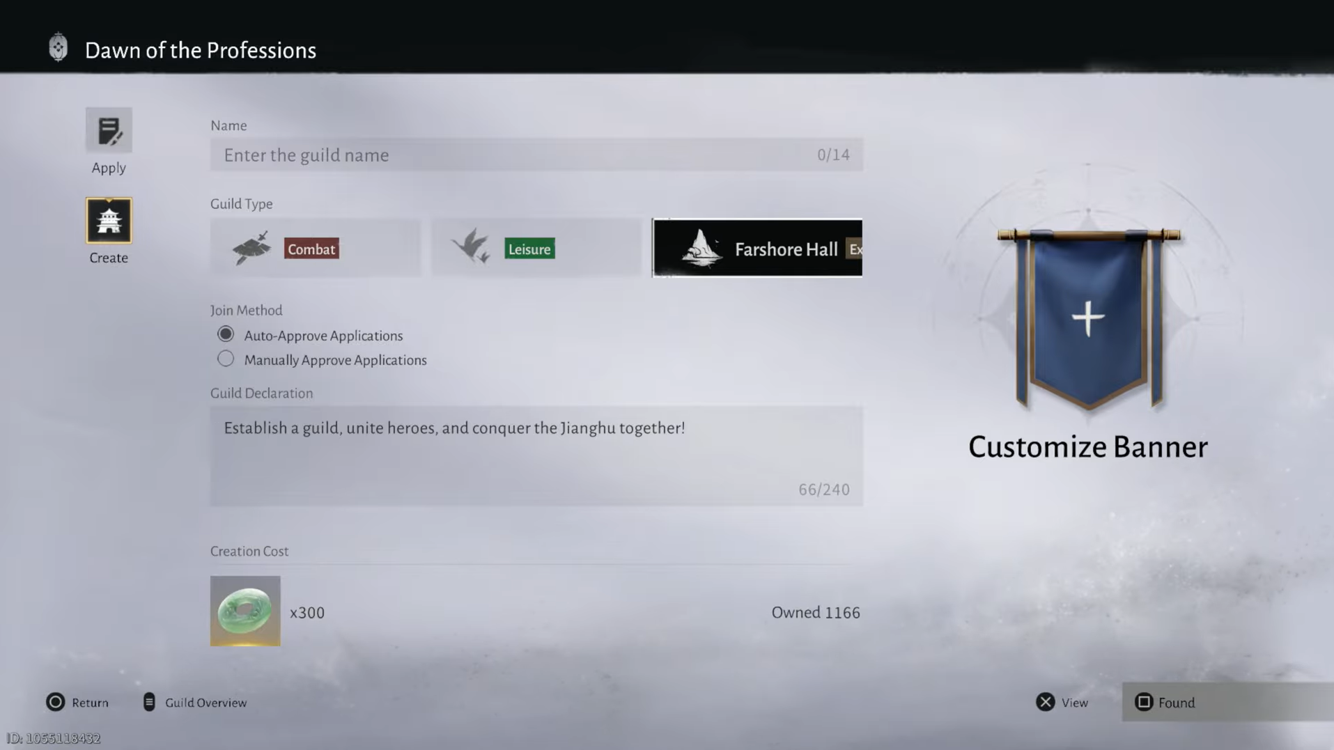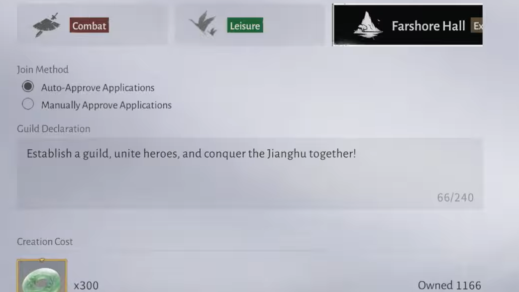Creating a new guild costs a fixed amount of premium currency (300 Jades/Jet coins). The founder chooses the type, name, and emblem, and can design a simple logo or lettermark for the banner.