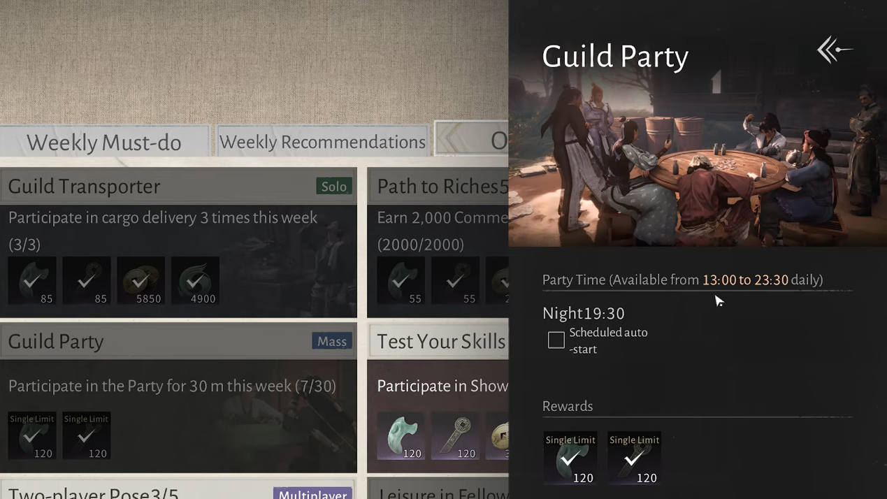 Spending a set amount of time (for example, 25 minutes) in the party zone completes the weekly objective. Officers can extend the party’s duration by consuming either a party item or premium currency. Each extension slightly increases the remaining time and rewards a bit of guild currency.