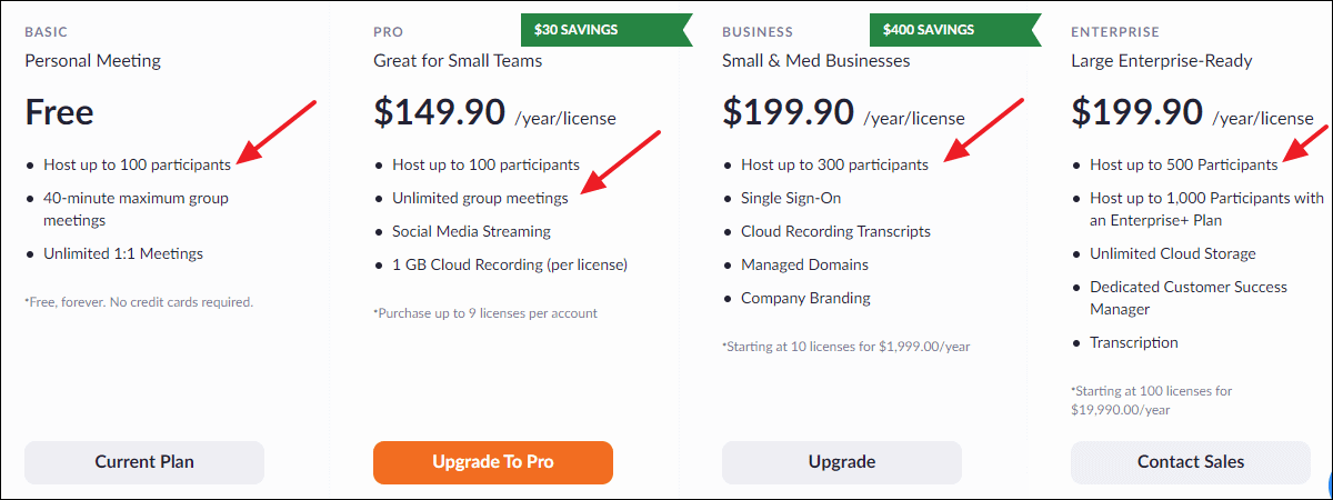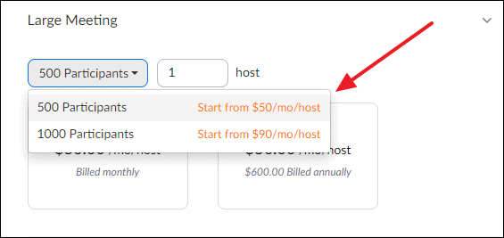 - In the Enterprise plan, you can host a meeting of up to 500 participants. It also costs $20 per month only, but you have to contact the Zoom sales team to avail this plan.
