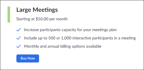 Zoom also provides an add-on plan called ‘Large Meetings’ that lets you increase the participant capacity for your meetings. You can have a meeting of up to 500 or 1,000 participants with this plan.