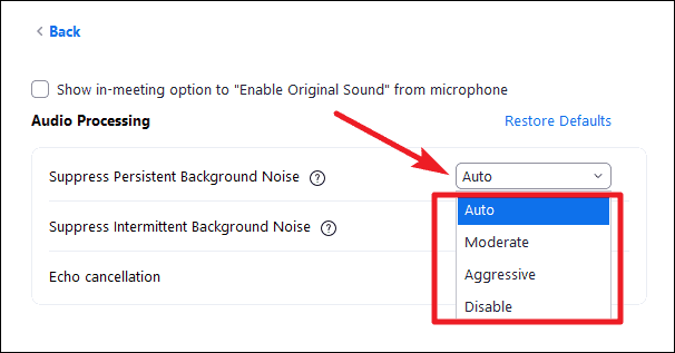The first one is the option to ‘Suppress Persistent Background Noise’. The persistent background noise includes any continuous noise in the background like the noise from your fans, or air conditioners, etc. By default, the setting is on ‘Auto’ but you can choose to turn it to ‘Moderate’, or ‘Aggressive’, or even ‘Disable’ it entirely. Simply click on the drop-down menu to expand the options and have your pick.