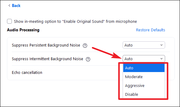 The next option is to ‘Suppress Intermittent Background Noise’. It uses deep learning to cancel any intermittent noises, including but not limited to the noise from your keyboard keys, door or chair movement, or tapping noises from a nervous participant. Similar to the previous option, the default setting is ‘Auto’, but you can set it to ‘Moderate’, ‘Aggressive’ or ‘Disable’ by selecting the option from the drop-down menu.