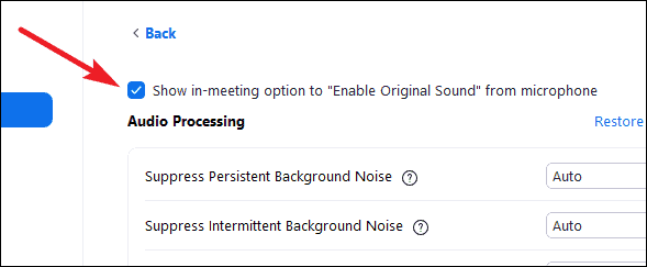 Alternatively, it is possible that you already have equipment for noise cancellation or you rely on other software for your noise cancellation needs, or simply don’t want to use noise cancellation at all. There is an option for that too. In the advanced sound settings, enable the checkbox for the ‘Show In-meeting option to “Enable Original sound” from microphone’.