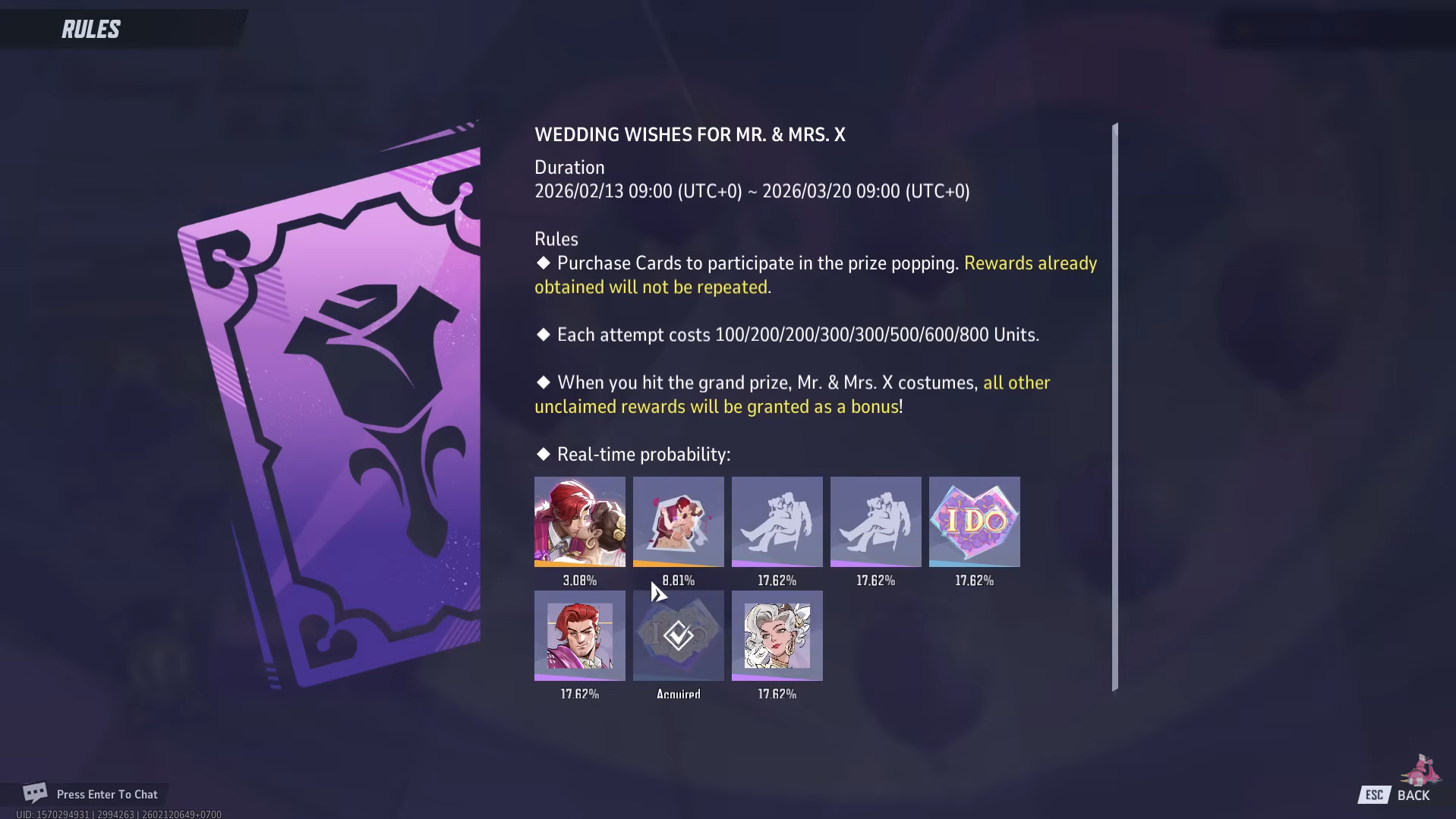 The Wedding Wishes for Mr. & Mrs. X event closes on March 20th, 2026, at 09:00 UTC. Once it ends, the balloon mechanic and all associated rewards will no longer be available in the store. Whether you pop on day one or wait until the final week, the pricing structure and reward pool remain identical throughout the event window.