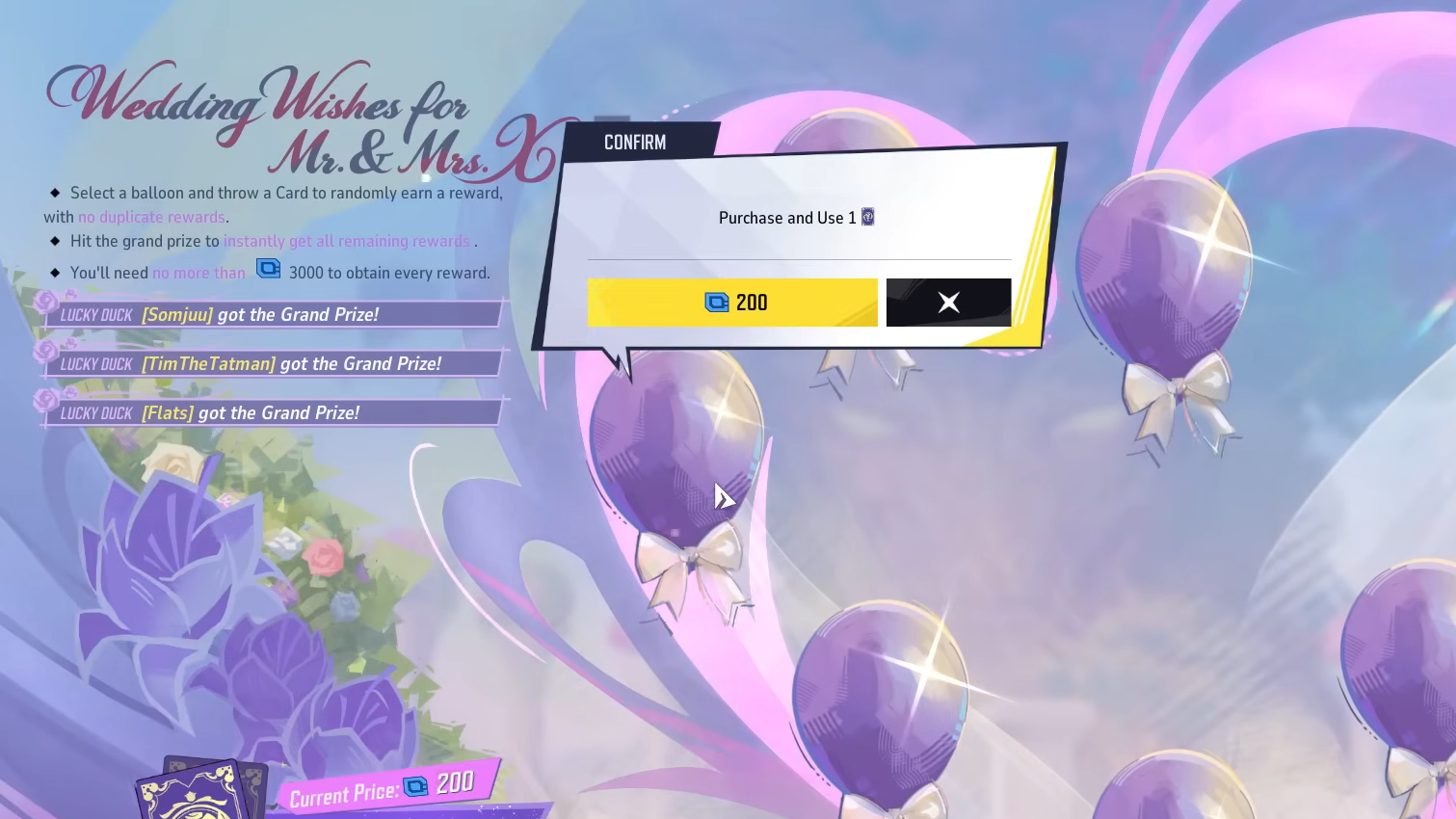 Unlike a traditional event pass or a flat-price store bundle, Wedding Wishes presents eight balloons on screen. Each balloon hides one reward, and you throw a playing card at a balloon to pop it. The cost per attempt escalates with each pop, and the pricing is not a simple linear increase.