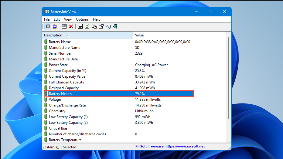 Third-party tools like BatteryInfoView can provide information regarding the battery health of your laptop.