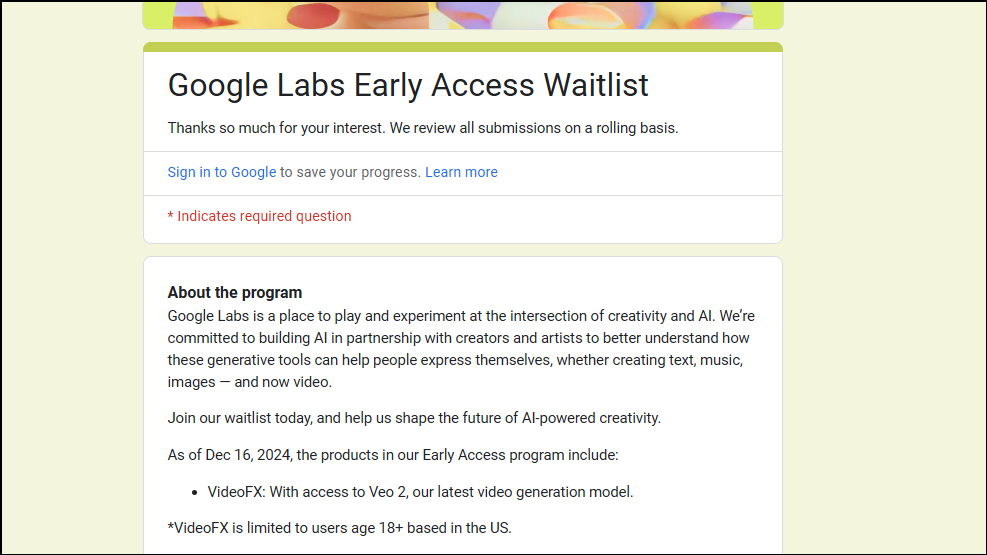 - This will open up a new page containing a form that you need to fill. You will have to enter your details like name, email address, country of residence, age, etc. Also, you will need to provide a link showing how VideoFX is relevant to your work. Keep in mind that right now, access is only available to US residents.