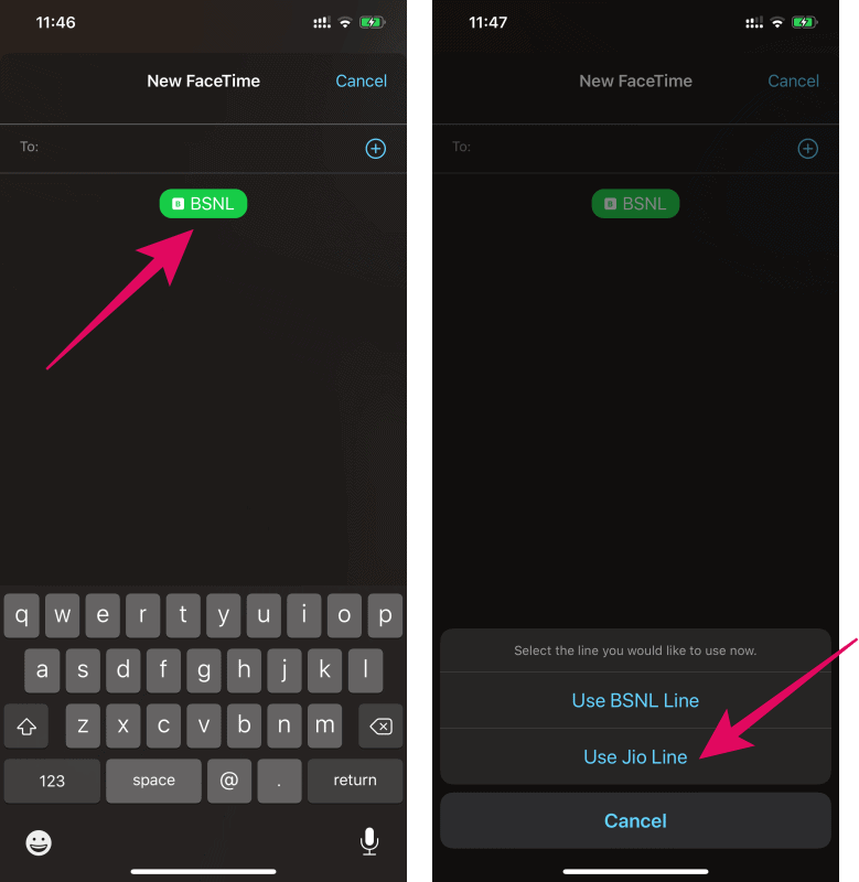 Now to make a FaceTime call with your second number, tap the primary number’s label on the “New FaceTime” call screen and select the line you’d like to use for the call.