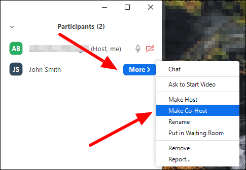 From the ‘Participants’ list, hover over to the name of the attendee whom you want to make a co-host and click the ‘More’ button next to their name. Then, select the ‘Make Co-Host’ option to share host-controls with another user.