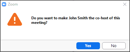 When prompted, click on the ‘Yes’ button to confirm the changes and make an attendee your co-host for the duration of the meeting.