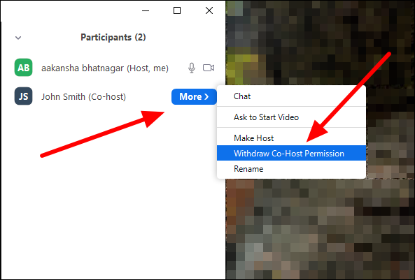 From the ‘Participants’ list, hover over the co-host name and click the ‘More’ button.