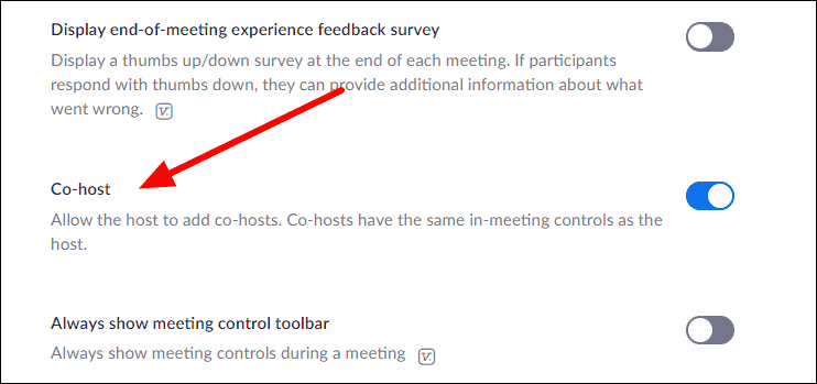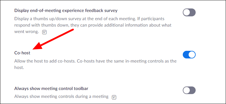 From the ‘Meetings’ tab, scroll down until you find the ‘Co-host’ option. Then slide the toggle switch to enable the service for all members within your organization.