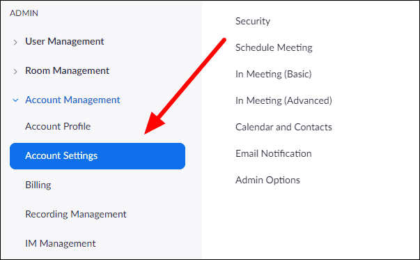 To enable co-host for all members in your organization, login to your Zoom account through a web browser, and then under the ‘Admin’ section on the left panel, click on the ‘Account Management’ option to expand the menu. After that, click on the ‘Account Settings’ link.