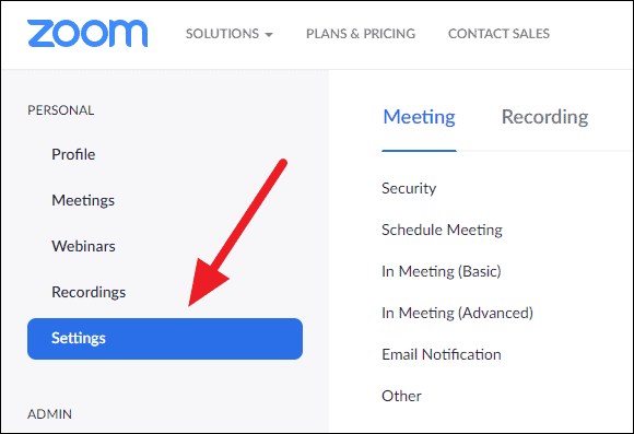 To enable co-host in your account only, first, go to zoom.us/signin and login with your credentials. Then, click on the ‘Settings’ link under ‘Personal’ heading on the left panel. This will open the ‘Meeting’ settings screen on the right side.