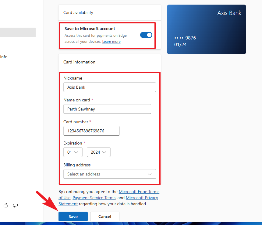 Step 7: A form will appear where you can enter your card details. Fill in the required information such as the card number, name on the card, expiration date, and billing address. If you want to save this card to your Microsoft account for use across devices, enable the toggle labeled 'Save to Microsoft Pay' at the top of the form. After entering all the details, click the 'Save' button to add the card to your Wallet.