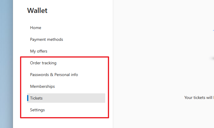 In addition to managing your payment methods, Edge Wallet allows you to track orders from select websites, manage memberships and tickets, and access saved passwords—all from within the Wallet interface. Simply click on the respective tabs in the left sidebar to explore these features.