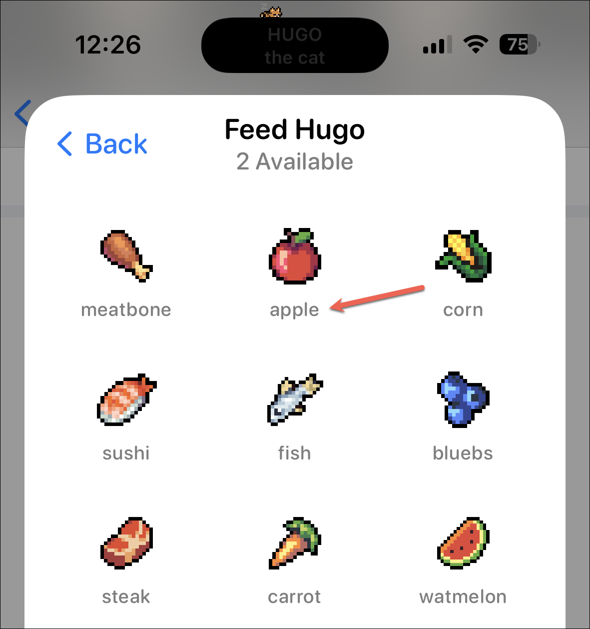 The options available for feeding your pet will appear. Food is limited but you can find more while using the app, such as by scrolling, upvoting, commenting, or posting. You can also unlock more food when you buy an Apollo Ultra subscription. Feeding them increases their hearts.