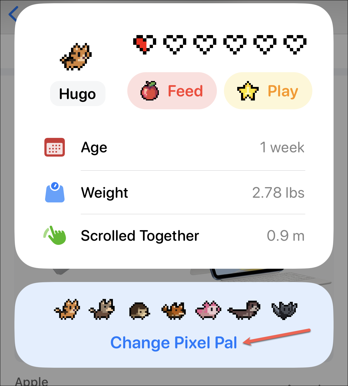 An overlay menu would open. You can see all the stats for your pixel pal, including its age, weight, and time scrolled together.