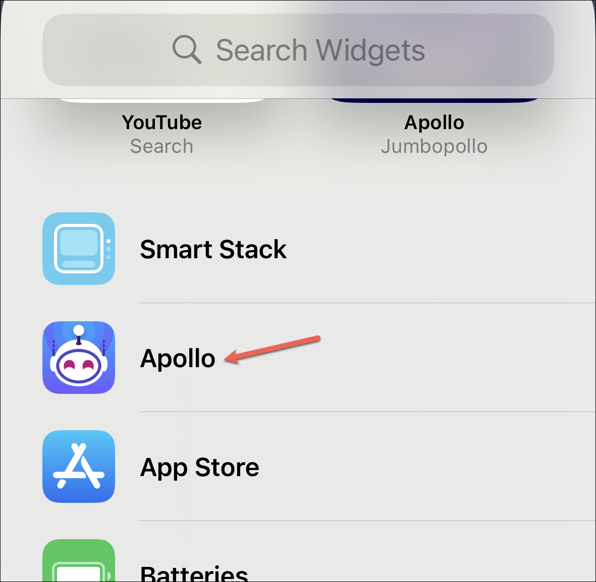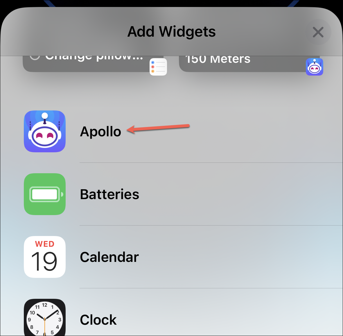 An overlay menu for adding home screen widgets will open. Select ‘Apollo’ from the list of apps.