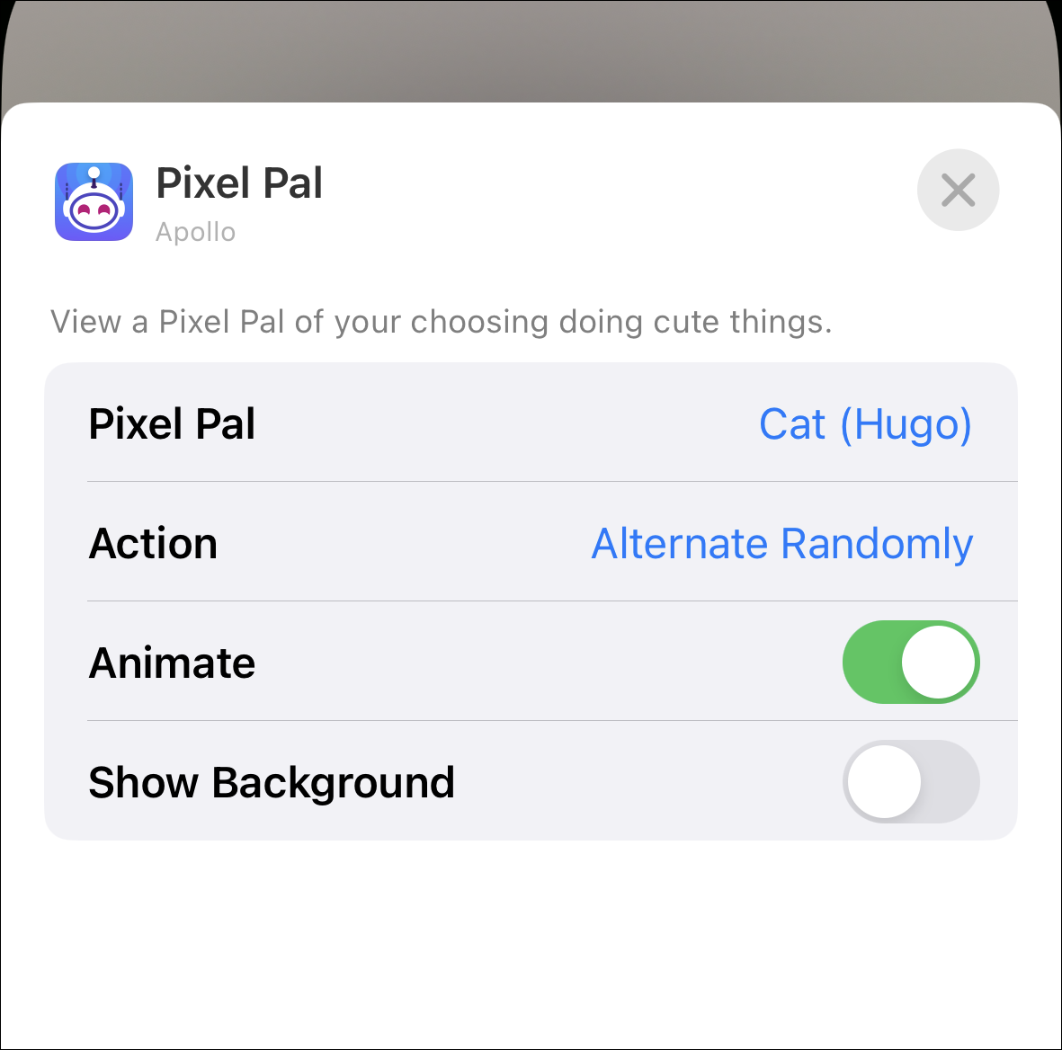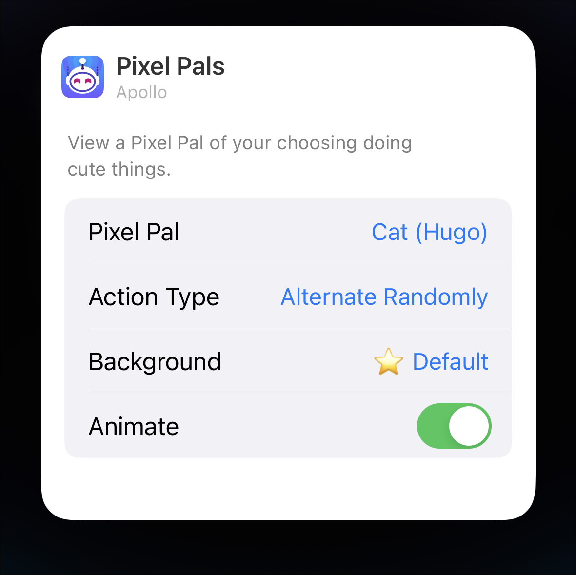 For the lock screen widget, you can change the Pixel Pal, its action, choose to animate it and choose to show the background. Changing the pet for the lock screen widget does not alter it for the Home screen widget or the Apollo app (for iPhone 14 Pro users). Tap each action in the menu to alter it.