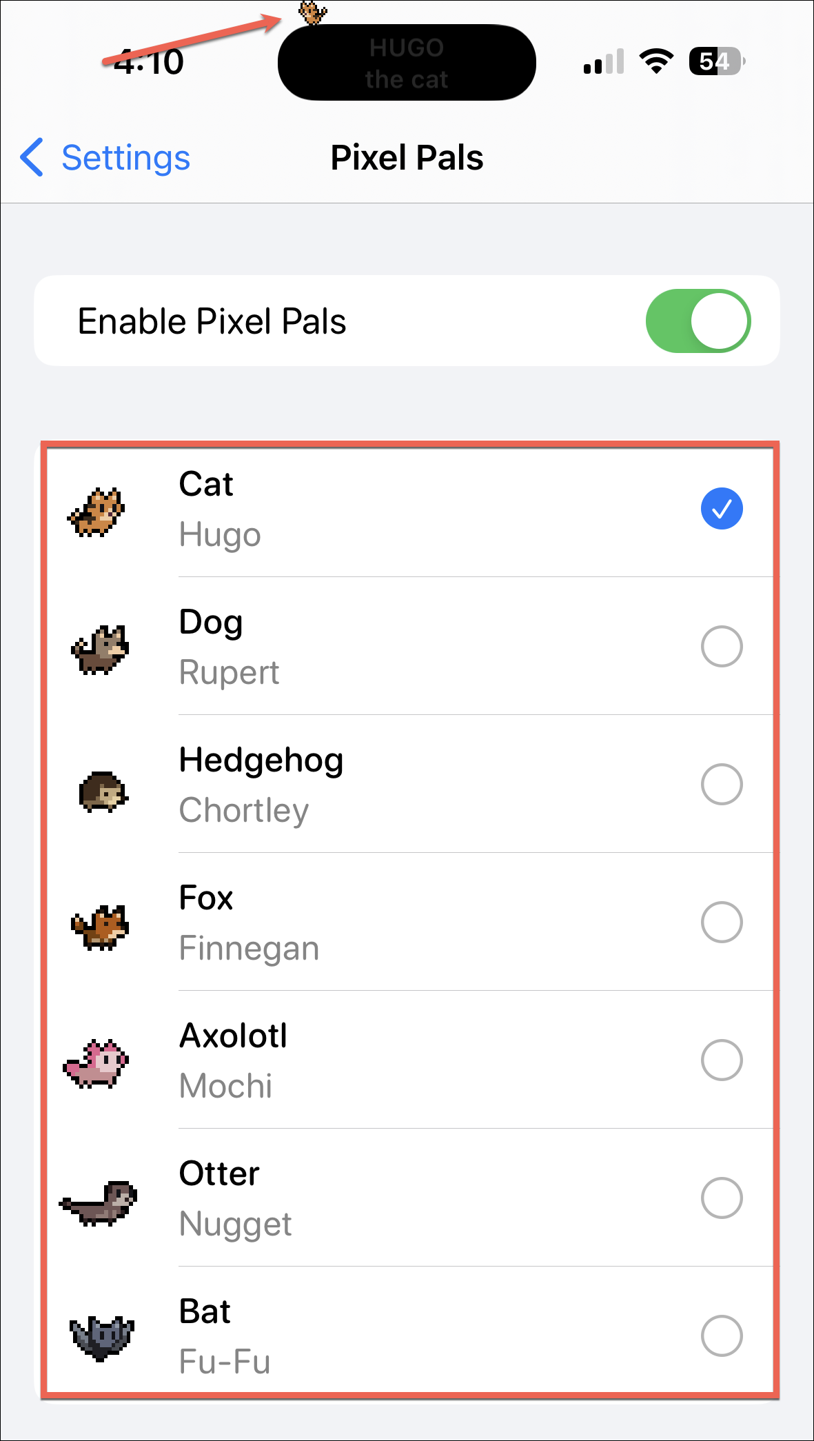 By default, Hugo, the cat, will appear on your dynamic island. Tap another pet to switch to it instead. Only Hugo the cat, and Rupert the dog are available for free. Other pets – which include Chortley the hedgehog, Finnegan the fox, Mochi the axolotl, Nugget the otter, and Fu-Fu the bat – are only available with the Apollo Ultra subscription at the time of this writing. The developer keeps adding more pets, so there might be more in the future.