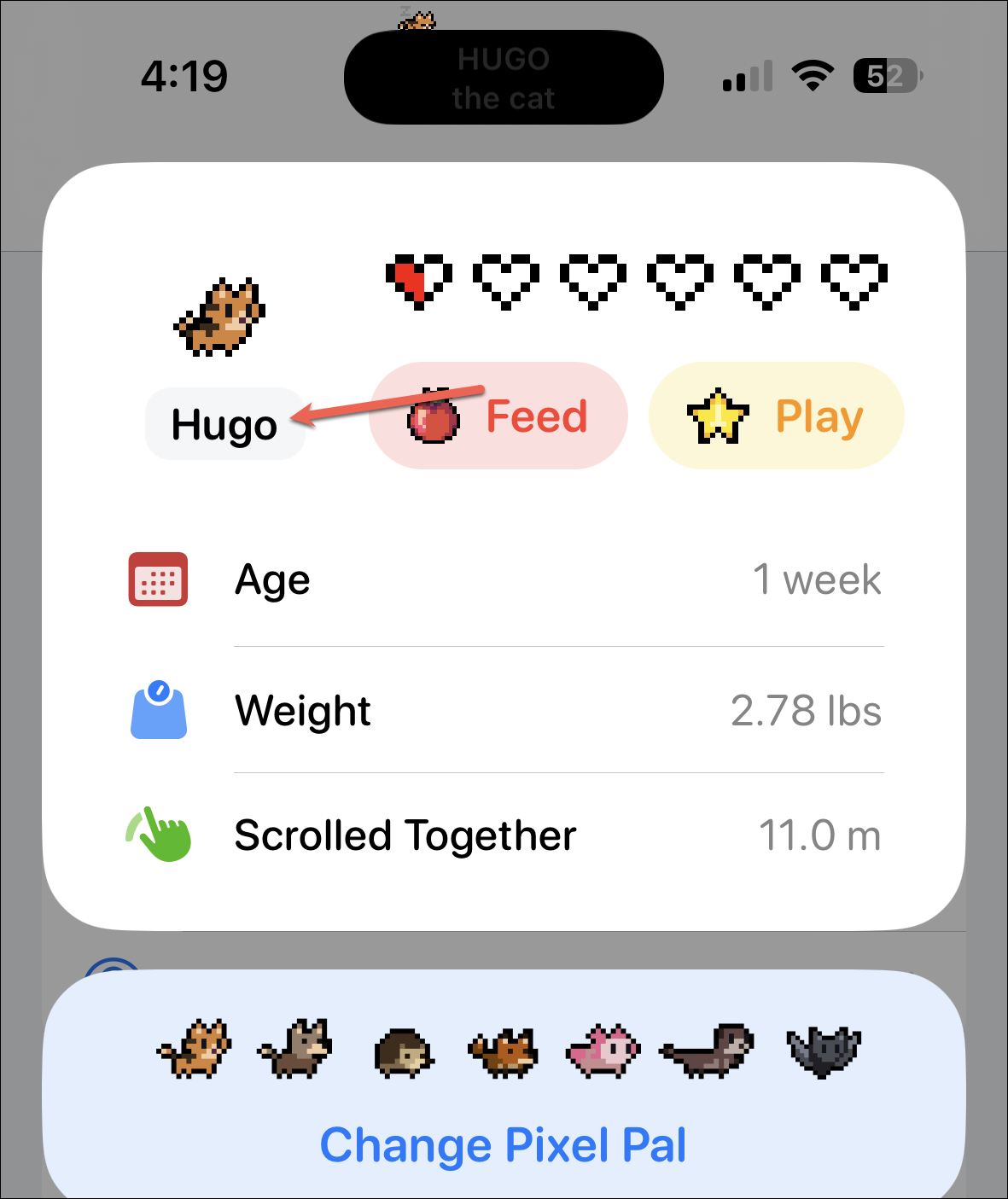 To change your pet’s name, tap the current name.