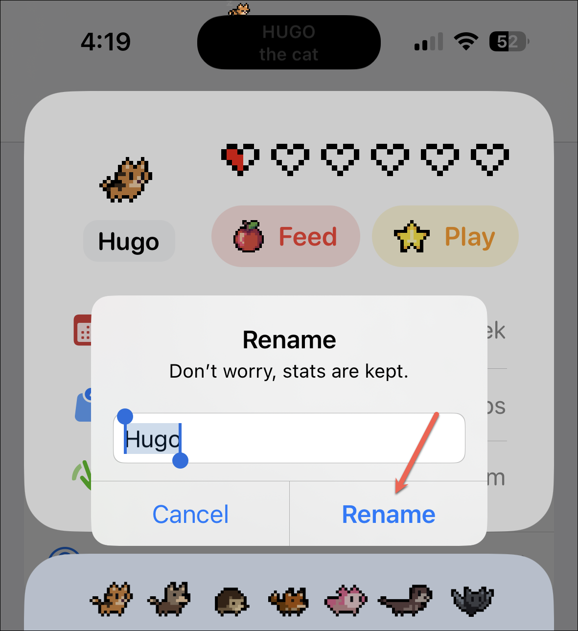 Then type the new name and tap ‘Rename’. Renaming your pet won’t reset the stats.