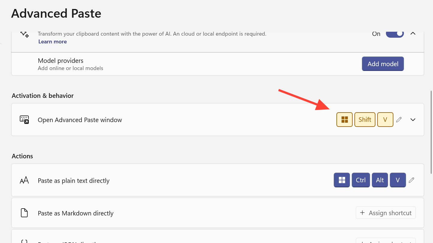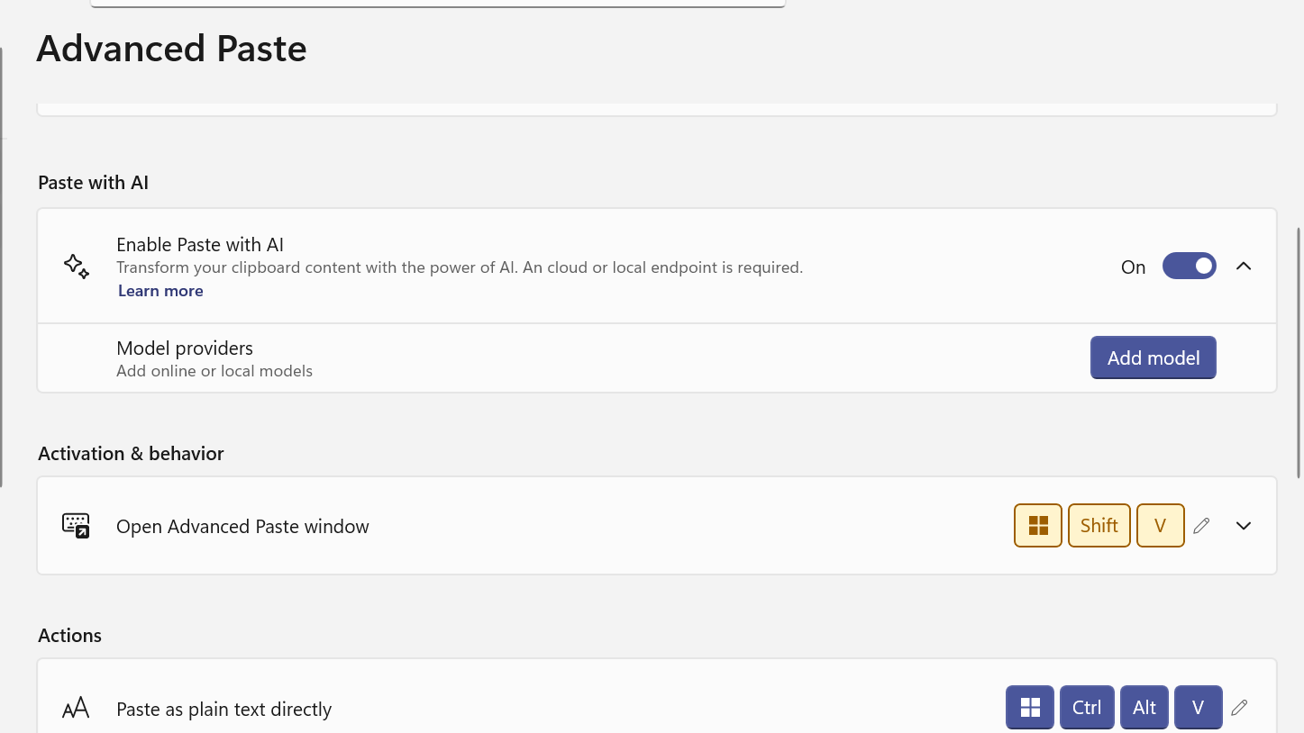Ctrl + V as the activation shortcut, but overriding the core paste key tends to break habits and can confuse other apps. Leaving it alone is safer.Adding a model provider in PowerToys