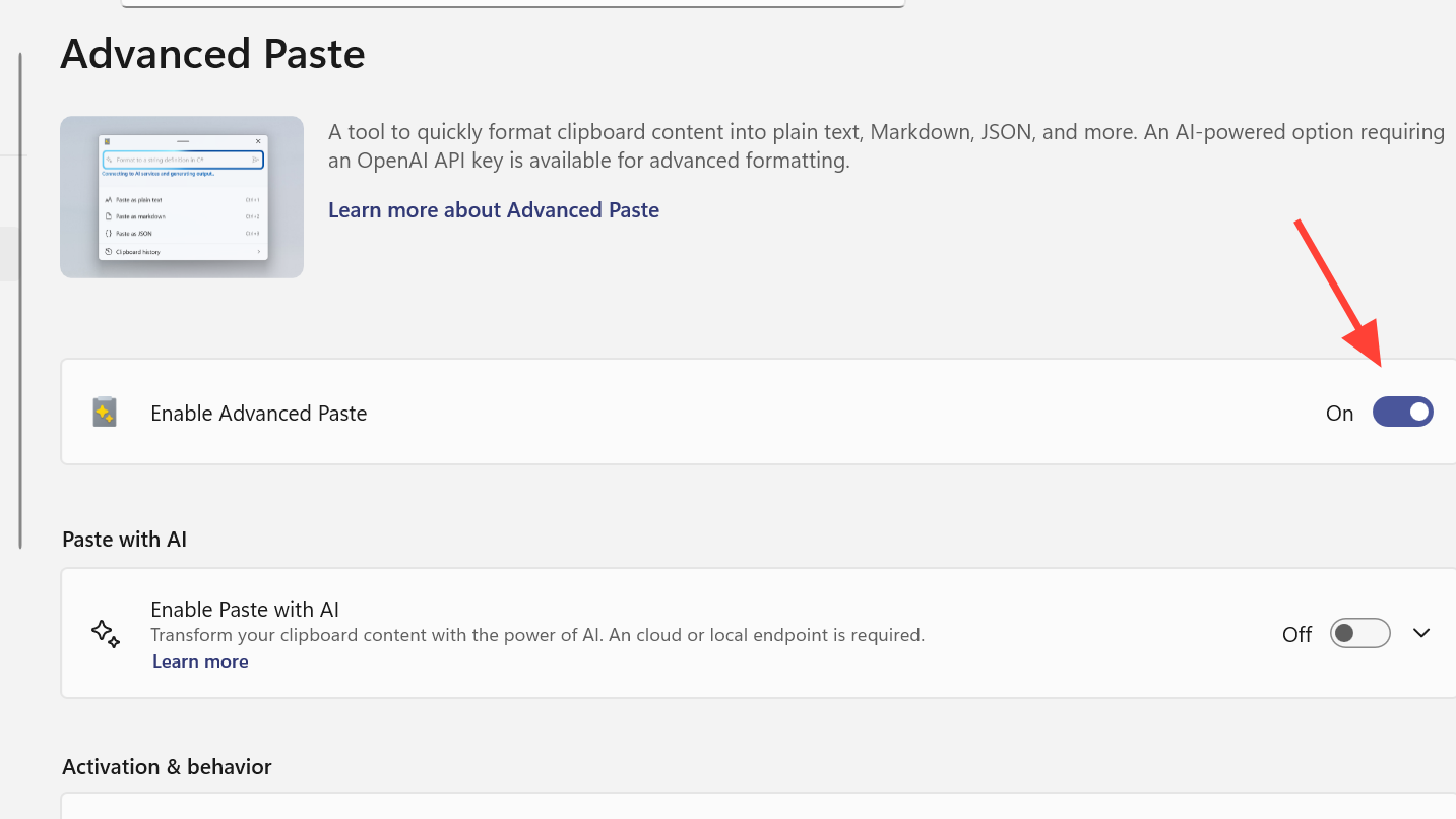 Enable Advanced Paste and Paste with AI
