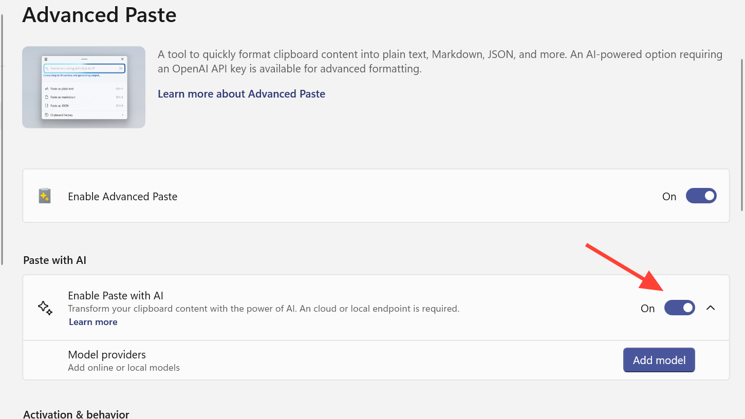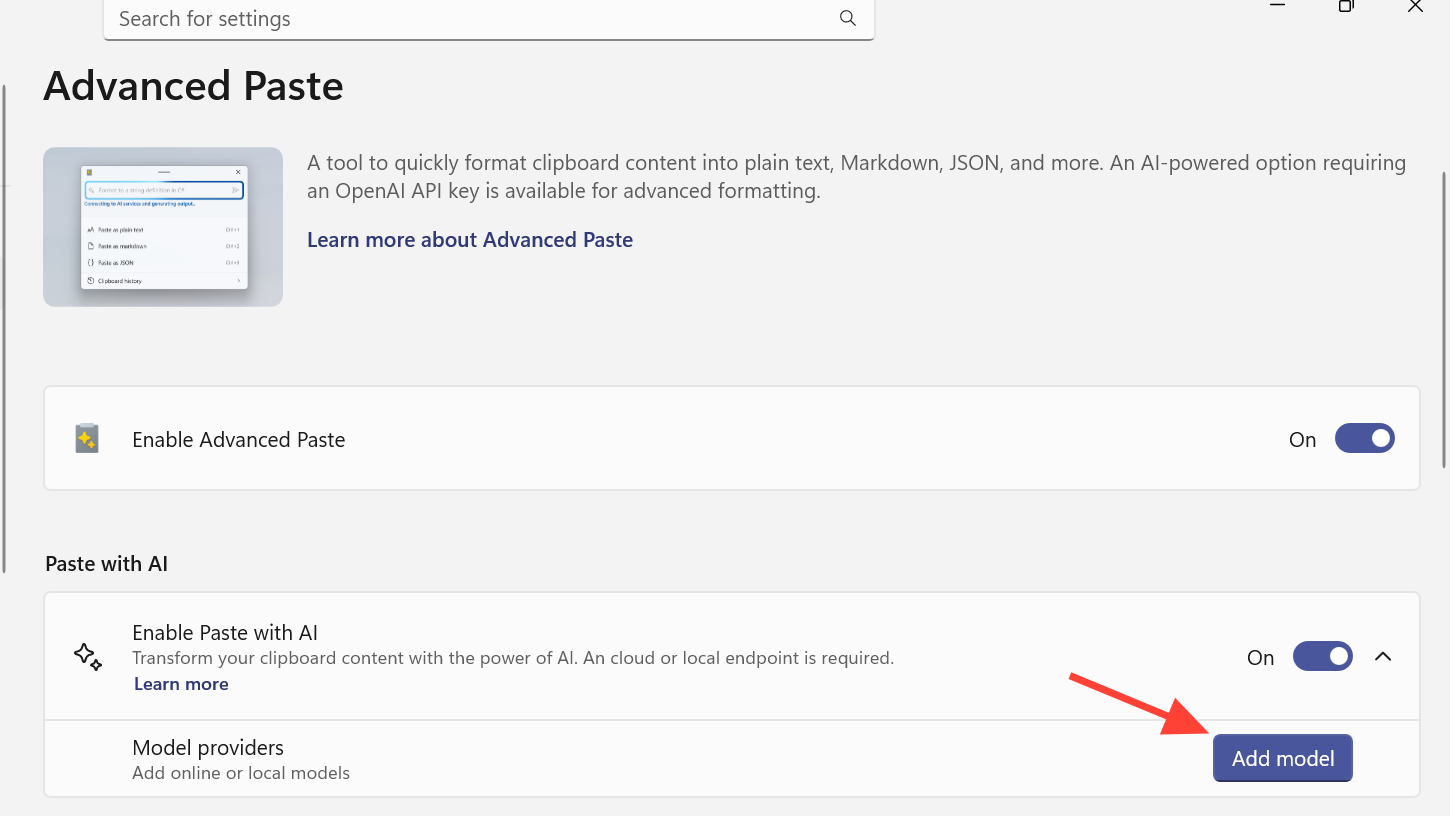 Before you can add a model provider, Advanced Paste itself needs to be active.
