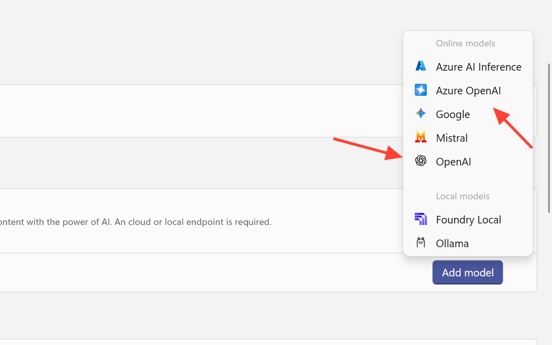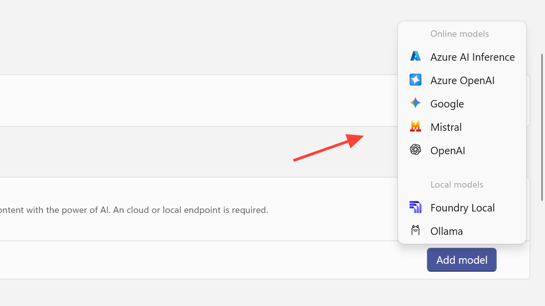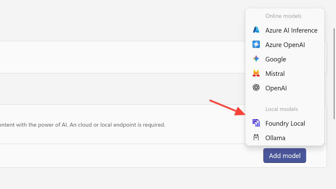 Step 2: In PowerToys, open Add model provider and choose Foundry Local or Ollama.