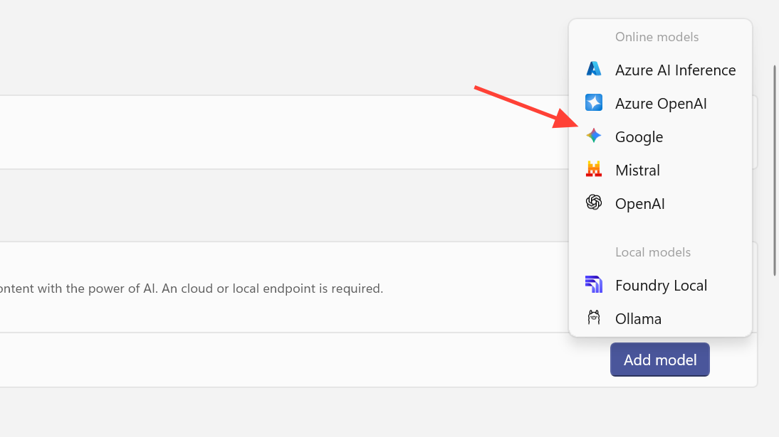 Step 1: In Add model provider, pick Google, Mistral, or Azure AI Inference.