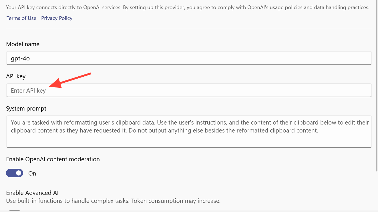 Step 2: For OpenAI, paste a valid API key and optionally refine settings such as the endpoint if you’re using a custom base URL. For Azure OpenAI, provide the API key and the Azure endpoint URL.