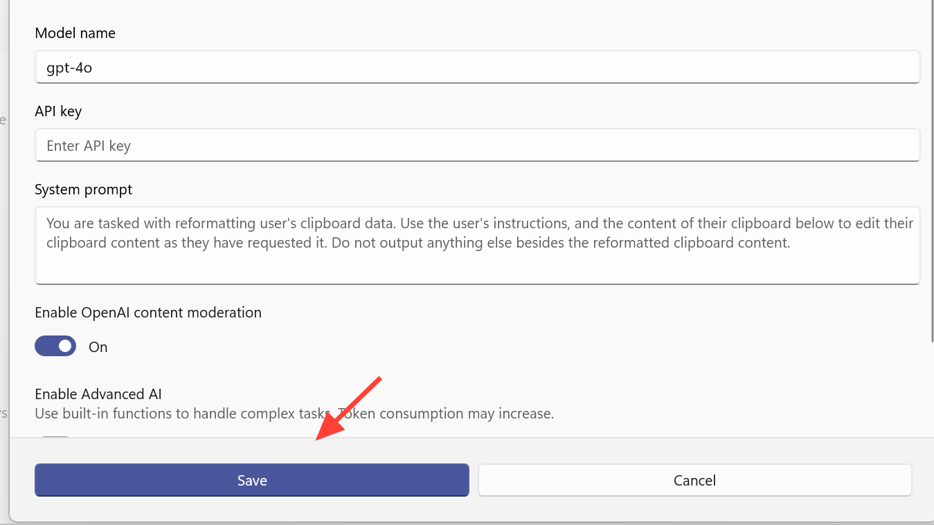 Step 3: Save the configuration. The models behind these services become available for Paste with AI and can be switched to from the Advanced Paste window.