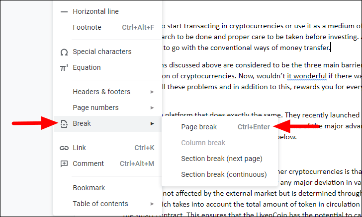 Step 3: Hover over the Break option in the dropdown menu, which will expand further options.