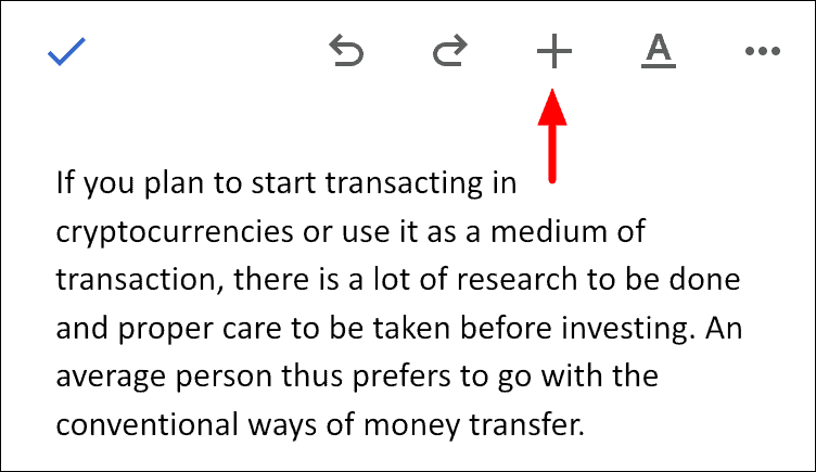 Step 2: Place the cursor at the point where you want the new page to start. Then, tap the + icon at the top right of the screen to access the insert options.